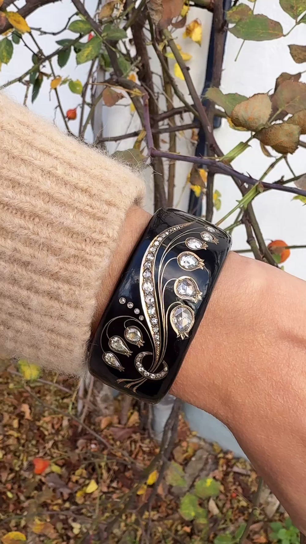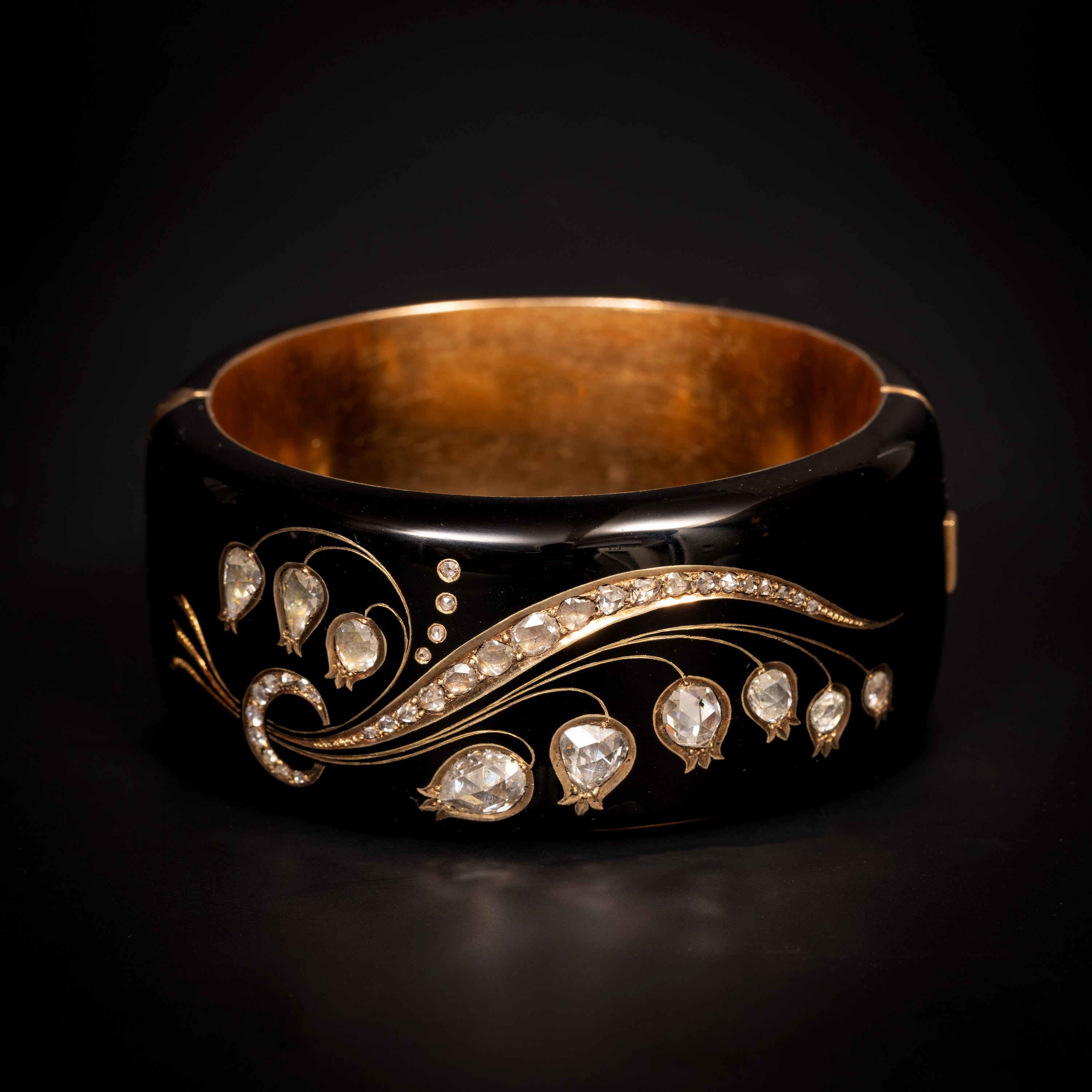 Een antieke herdenkingsarmband van 18-karaats goud met email en diamanten. De brede band is volledig zwart geëmailleerd en aan de voorzijde gedecoreerd met een lelietje-van-de-dalen motief, bezet met in grootte variërende roosgeslepen diamanten. Gekeurd voor het Oostenrijks-Hongaarse Rijk 1872-1922, een Nederlands importkeur uit de periode 1831-1893 en een meesterteken JB. Het etui gesigneerd C.J. Begeer (Carel Joseph Begeer), Utrecht.