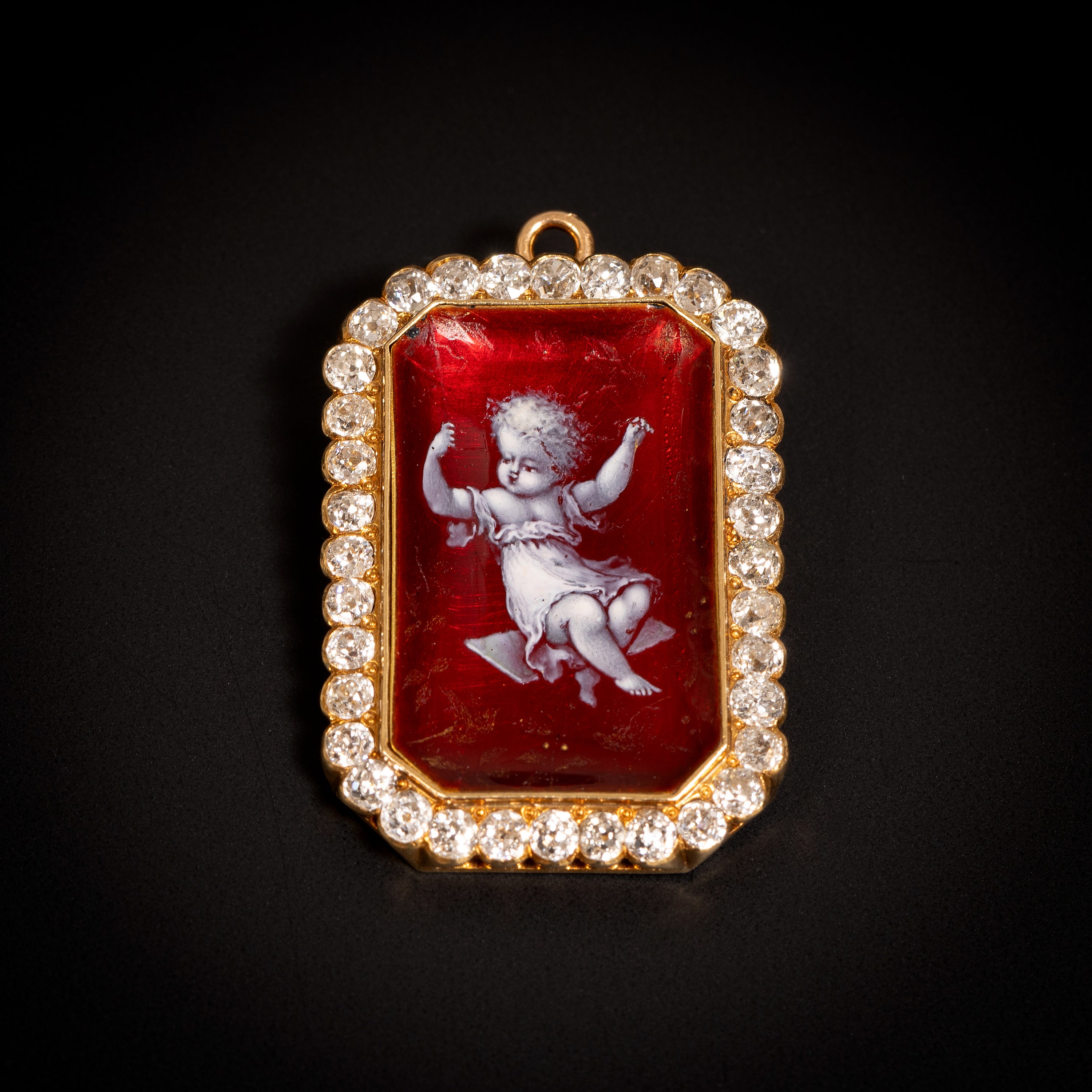 Antieke broche in 18-karaats goud met een email plaquette in rood met daarop in wit een schommelend kindje. Gouden zetting met circa 3 karaat oudslijpsel diamant.