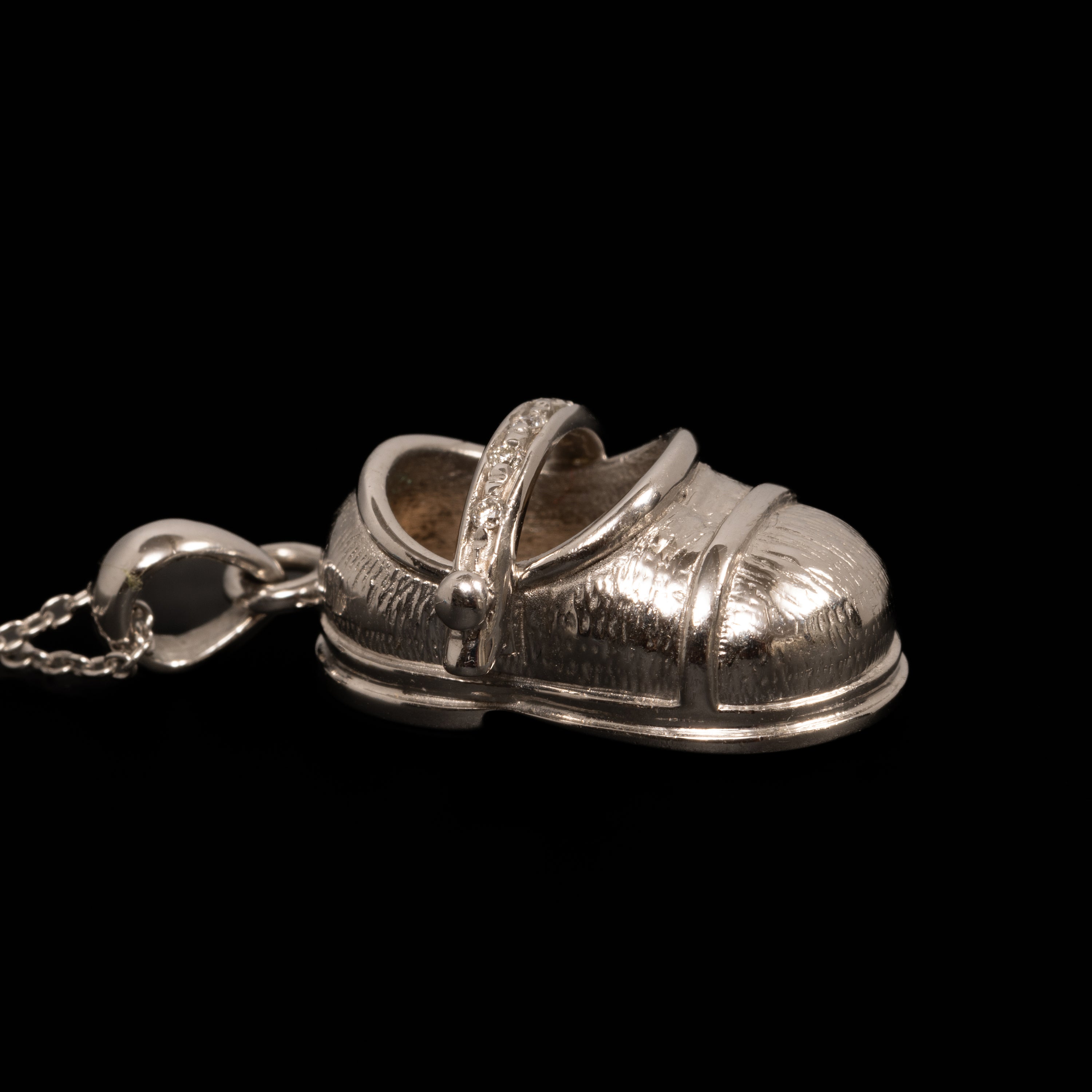 Een 18-karaats witgouden hanger in de vorm van een babyschoen, het bandje bezet met zes kleine diamanten (circa 0,05 ct). Italiaanse keurmerken.