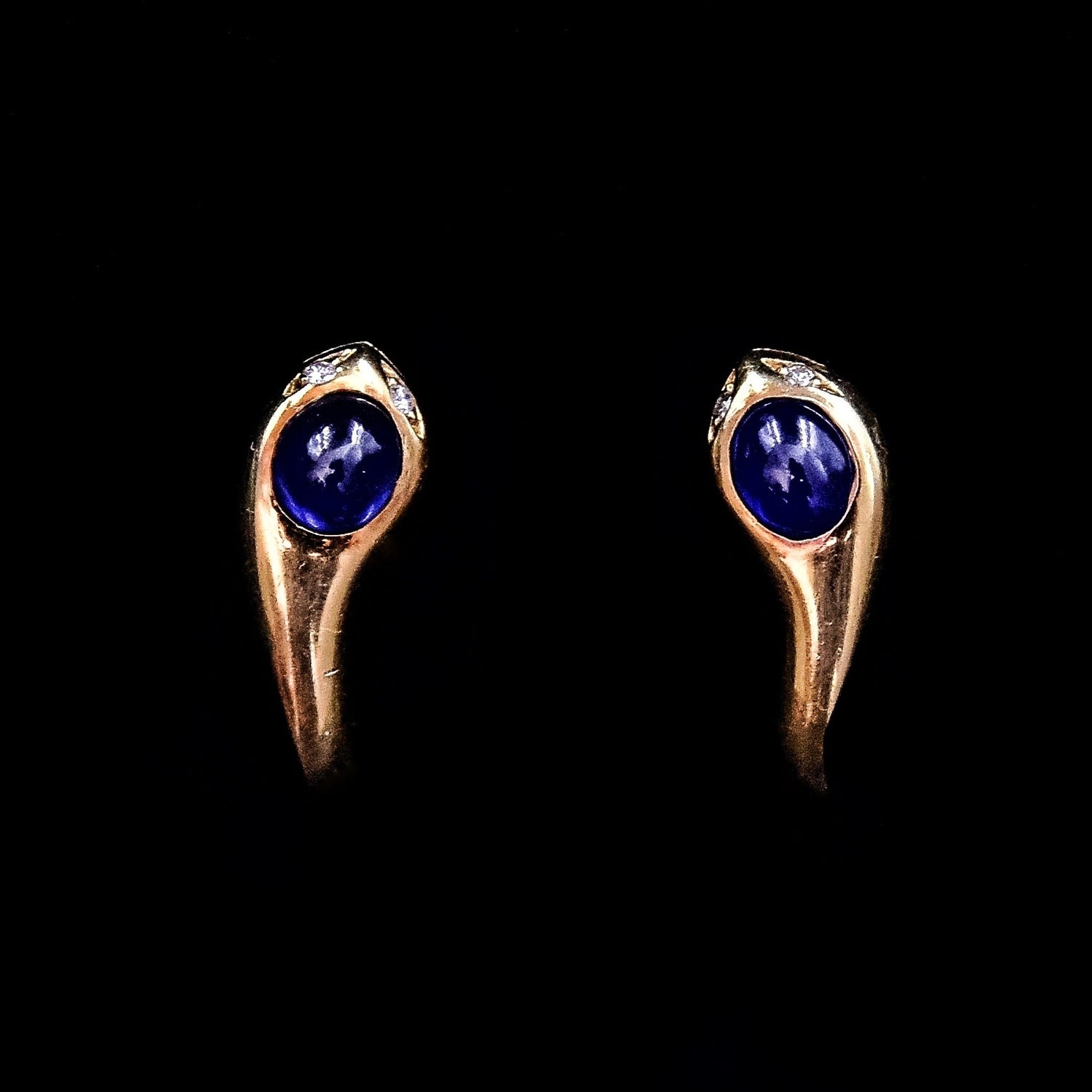Gouden oorbellen in de vorm van slangen, gemaakt in 18-karaats goud en bezet met cabochon geslepen saffieren en kleine diamanten in de ogen. Europa, circa 1940