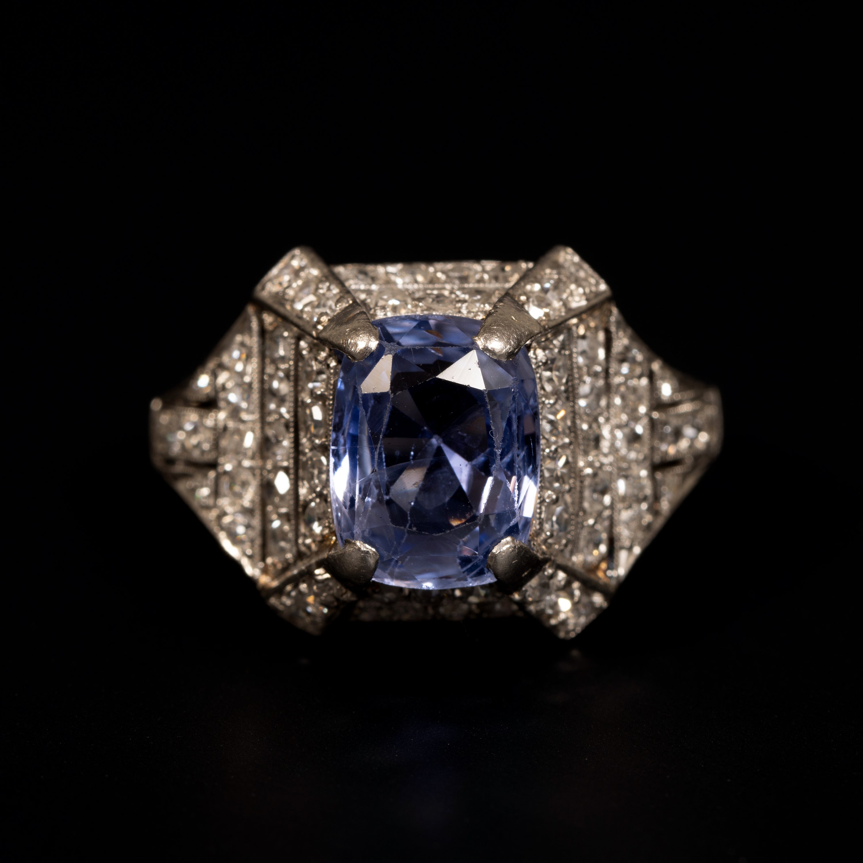 Een platina ring in Art Deco-stijl, bezet met achtkant geslepen diamanten (ca. 0,80 ct) en een kussenvormige blauwe saffier van ca. 3.13 ct. Gesigneerd CW en genummerd 1393. Ringmaat 18,5 mm / US 8.5.