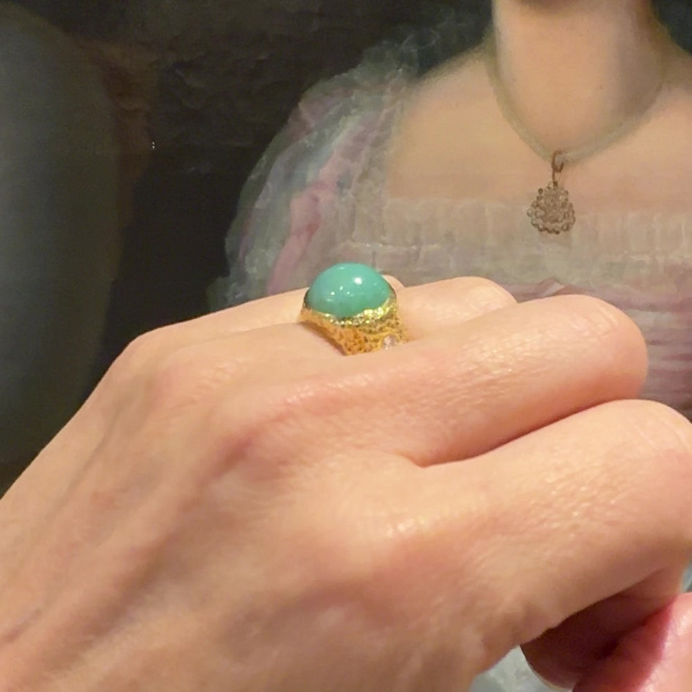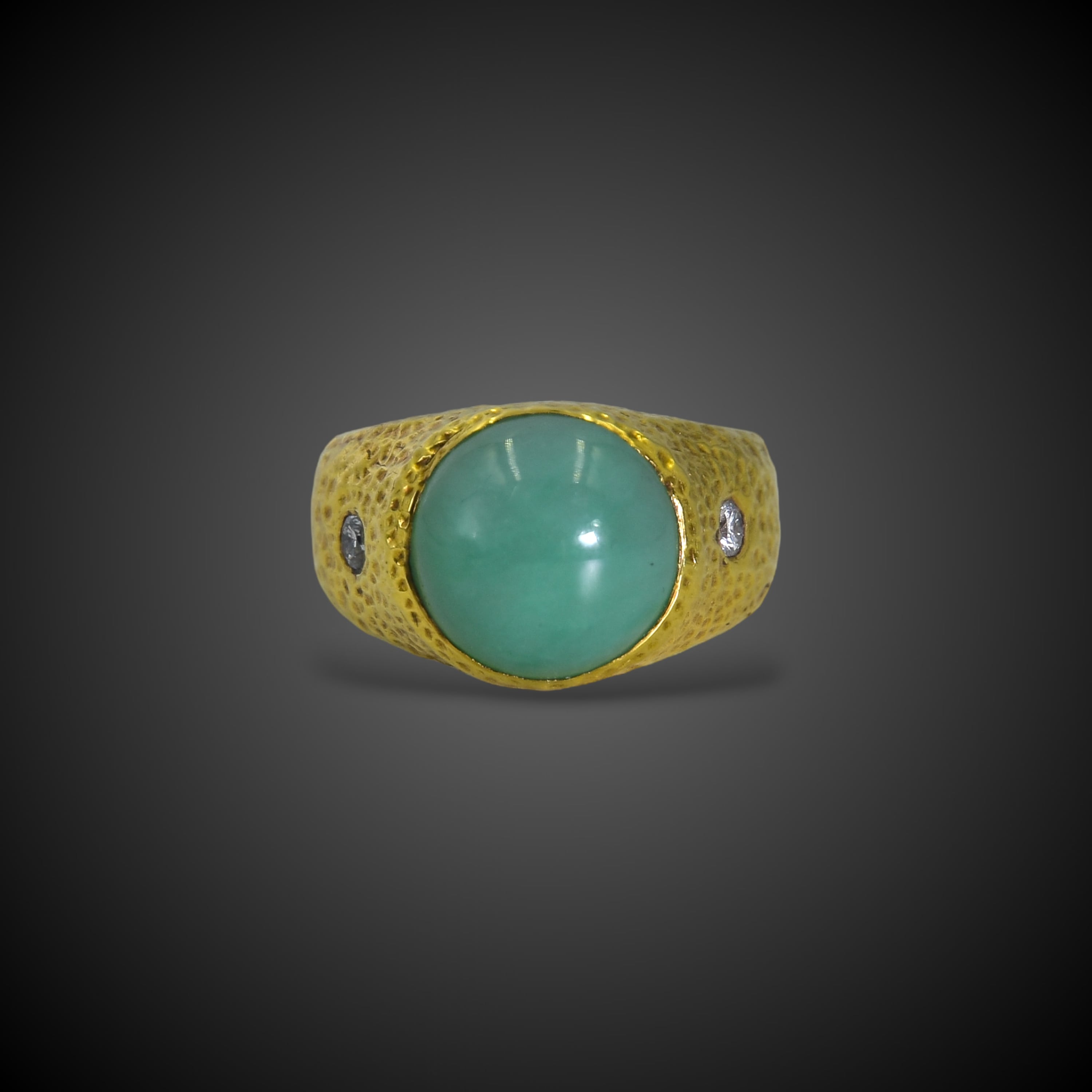 Een 18-karaats gouden gehamerde ring bezet met een ronde cabchongeslepen jade en geflankeerd door twee briljantgeslepen diamanten.