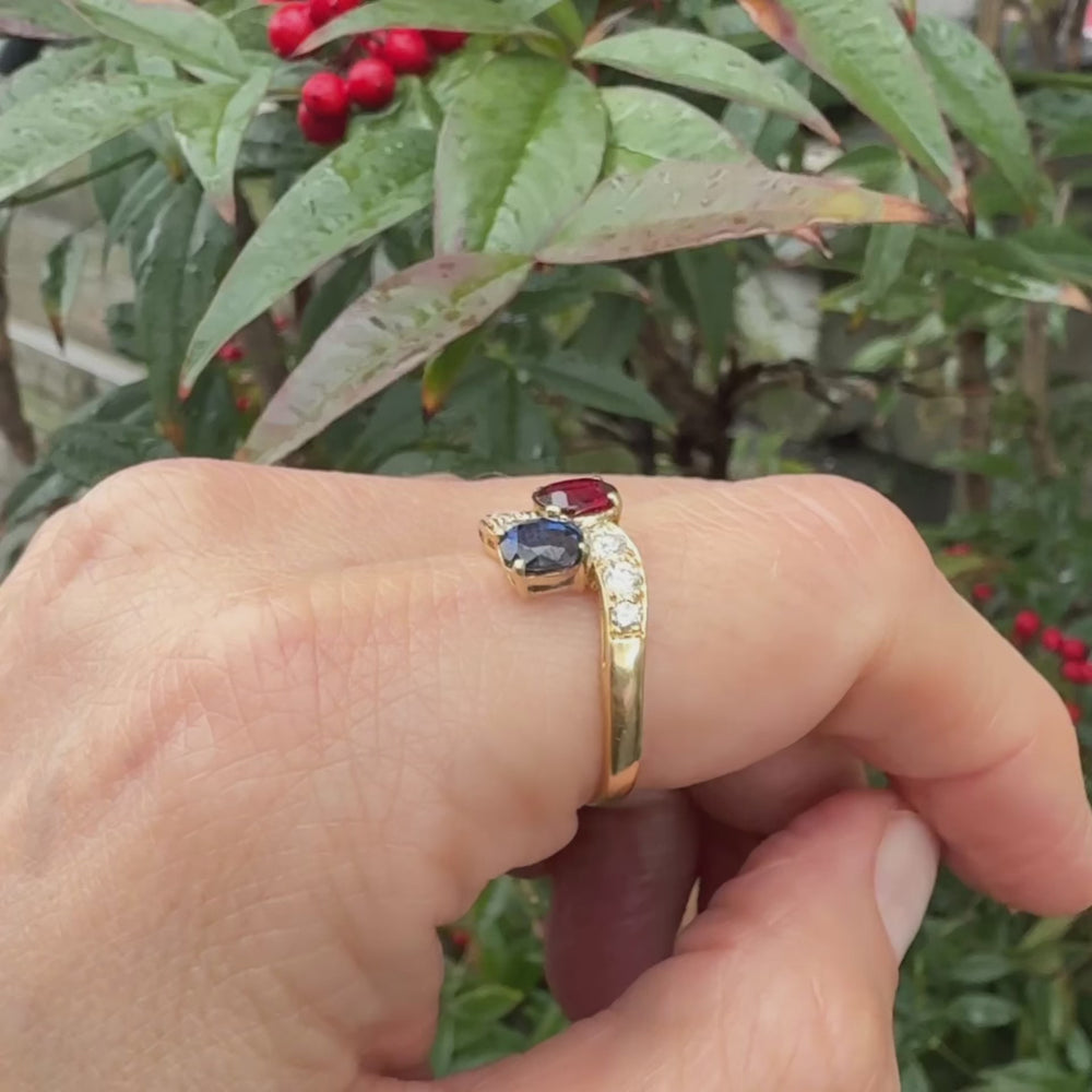 Een 18-karaats gouden toi-et-moi ring met zes briljantgeslepen diamanten (samen ca. 0,6 ct) , een ovale robijn (ca. 0,6 ct) en een ovale blauwe saffier (ca. 0,85 ct).