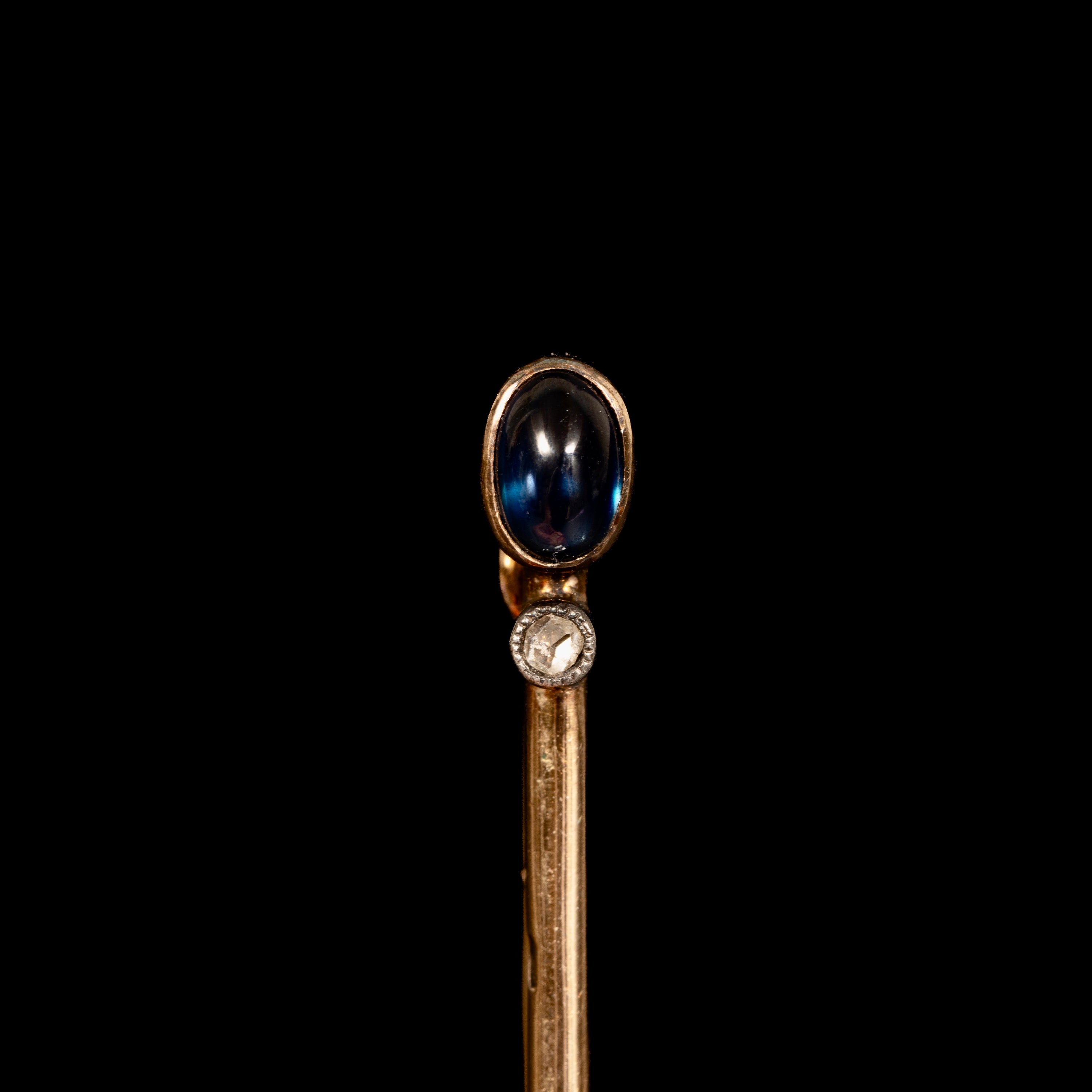 An antique 14-karat gold bar brooch set with a cabochon-cut blue sapphire (5.7 x 3.7 mm) and a small rose-cut diamond.