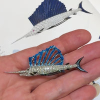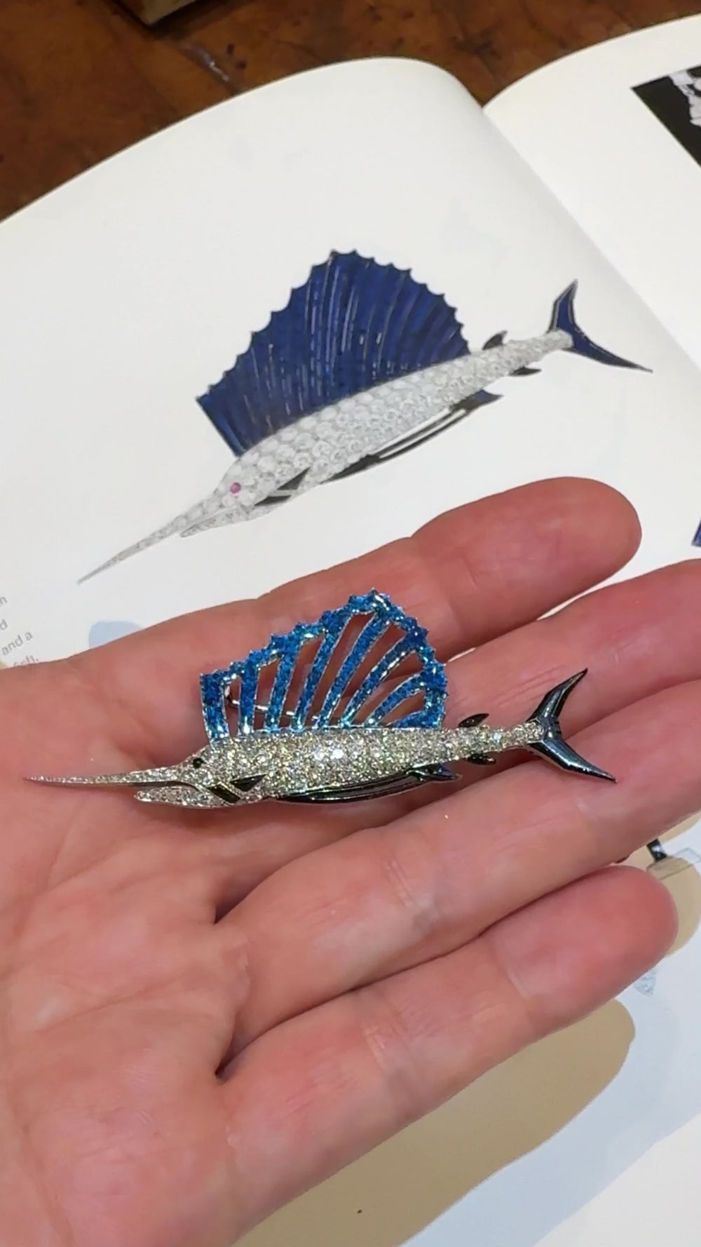 Art Deco broche van platina in de vorm van een blauwe marlijn, de vinnen bezet met email in blauw, zwart en grijs. De blauwe marlijn heeft bijna  geen natuurlijke vijanden en is een van de meest gewilde vissen voor sportvissers vanwege zijn grote snelheid, formaat en krachtige strijdlust.