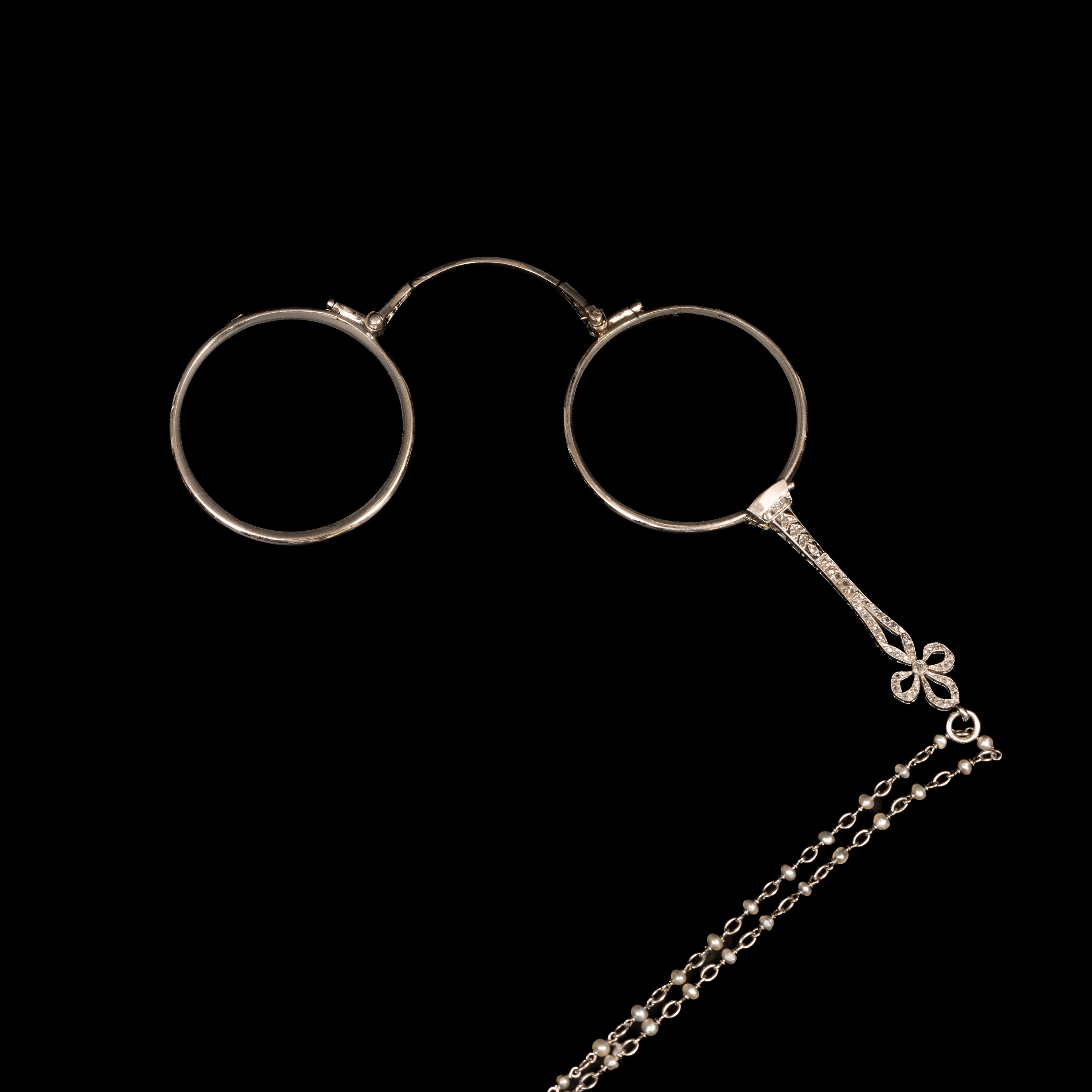 Een platina springlorgnet uit de Belle Epoque periode. Het handvat vol bezet met kleine roosgeslepen diamanten, Frans meesterteken in liggende ruit.