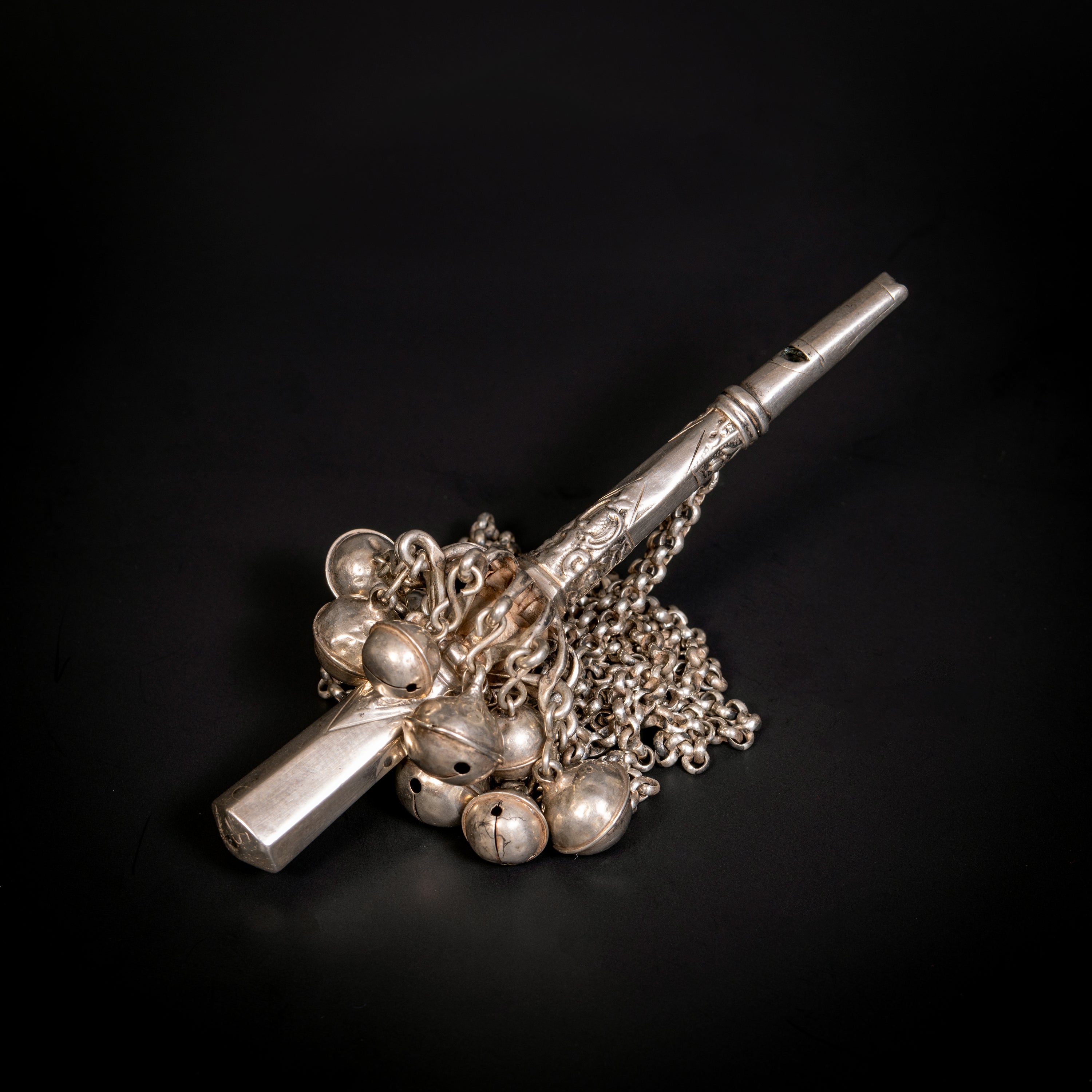 Zilveren rammelaar aan een prachtige, originele lange jasseronketting (142 cm), de greep met een gedreven decor van rocaillemotieven, Amsterdams meestereken onduidelijk. Onderaan het handvat de initialen C.I.S.